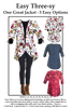 Easy Three-sy is a loose fitting jacket featuring an all-in-one Front & Sleeve, a jewel neckline that turns back to create a shawl collar, elbow length sleeves with easy overlapping tulip cuffs, and 3 Easy Back options. You choose between a full back, a pieced back, or lower back seam opening, with a fabric overlay!